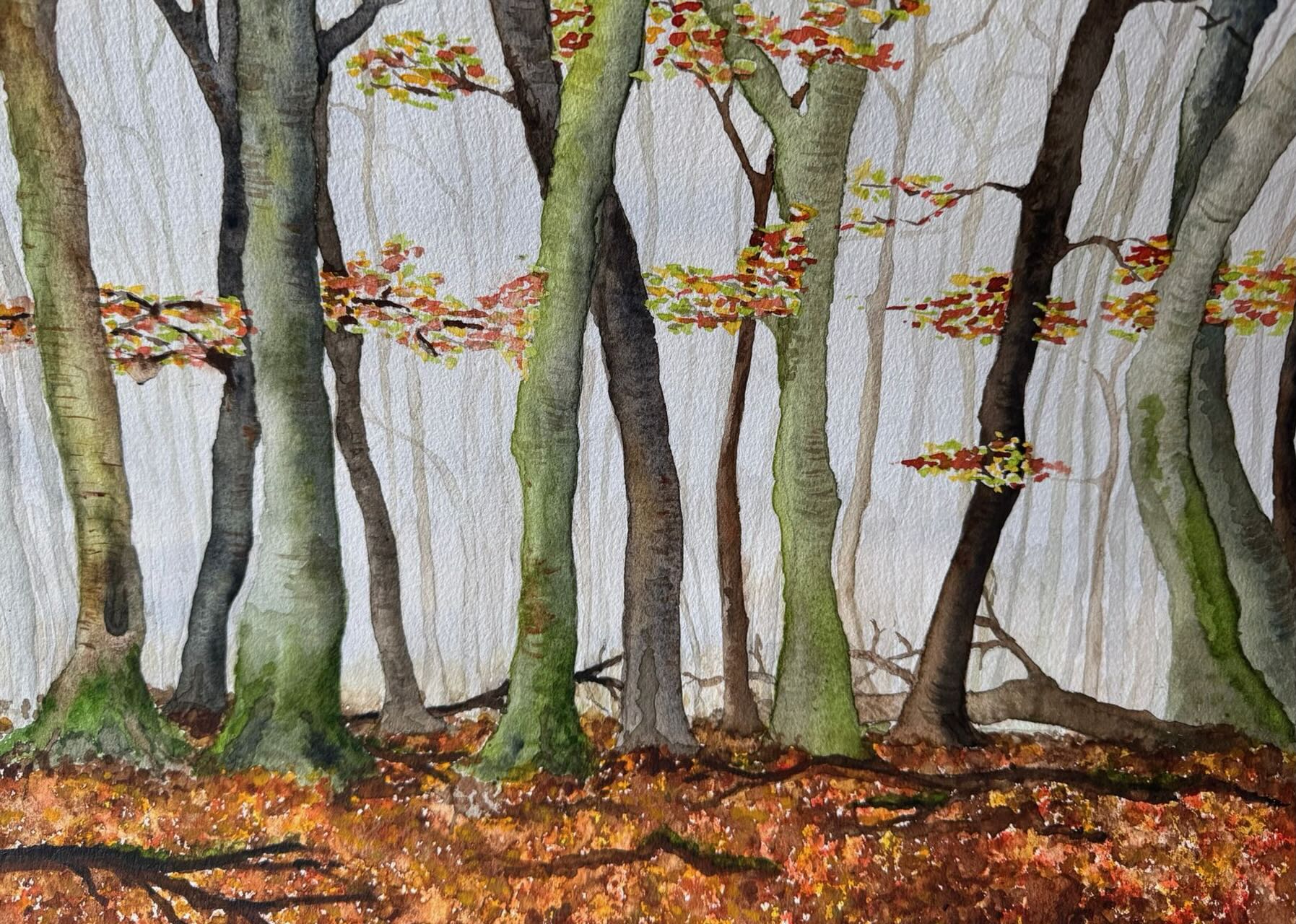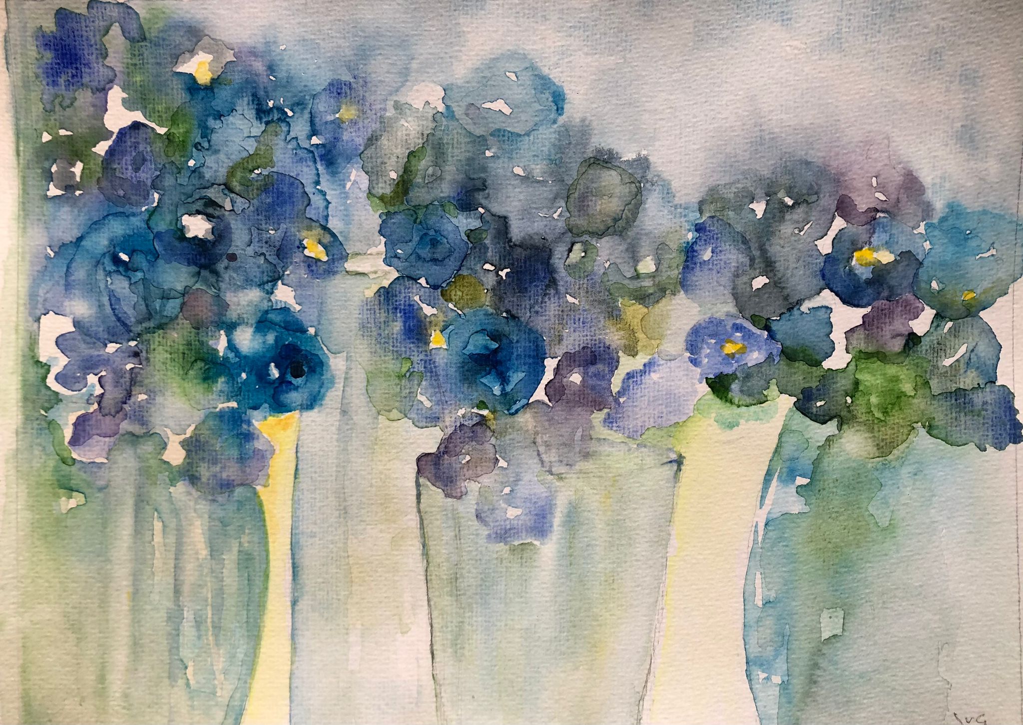 “Aangespoord door mijn dochter ging ik samen met haar naar een les aquarelleren. Ik ben nooit meer opgehouden, want het is zo verrassend om te zien wat er onder je handen gebeurt met dat water en de aquarelverf, die soms zelfs plotseling schift, hetgeen een prachtig effect geeft. Bovendien is het heerlijk om ongestoord en geconcentreerd bezig te zijn, vooral in drukke of spannende tijden. Het maakt mijn hoofd leeg.”